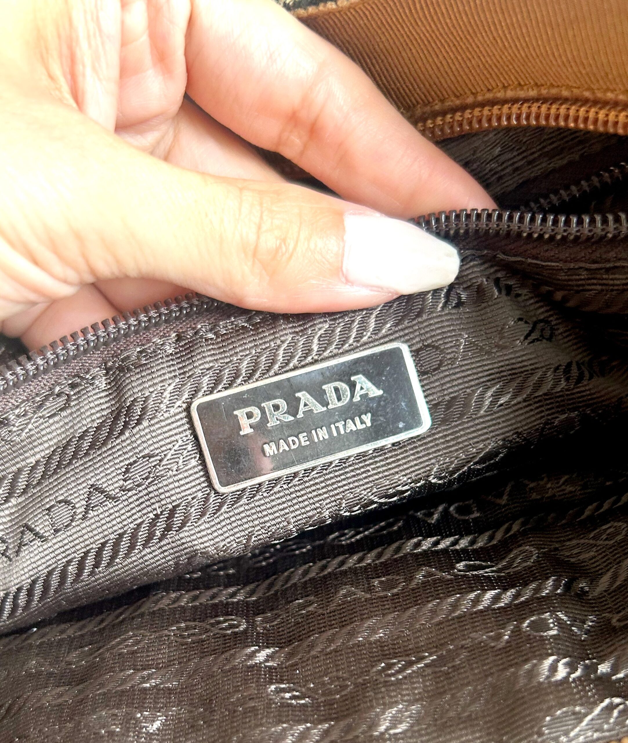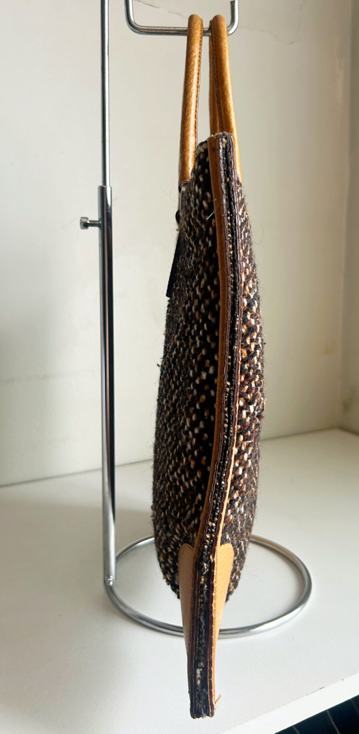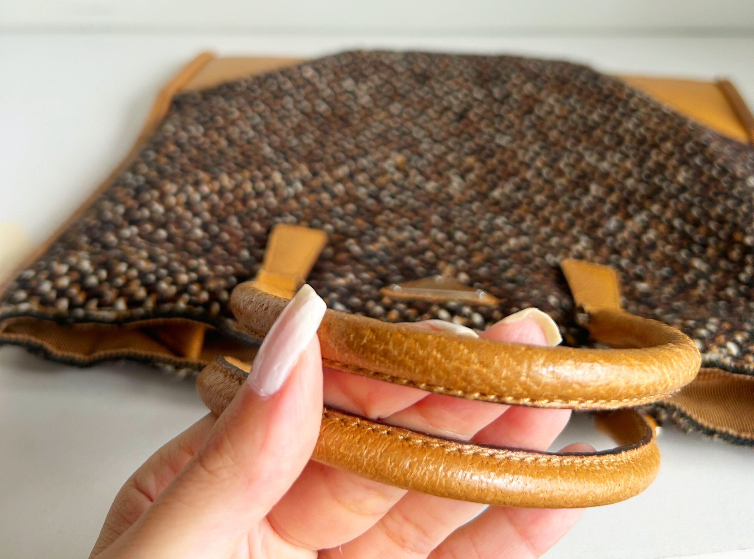 Bolsa Prada original. Modelo mini tote em tweed com detalhes e alças em couro caramelo. Em ótimo estado de conservação, mínimas marcas de uso. Acompanha card.